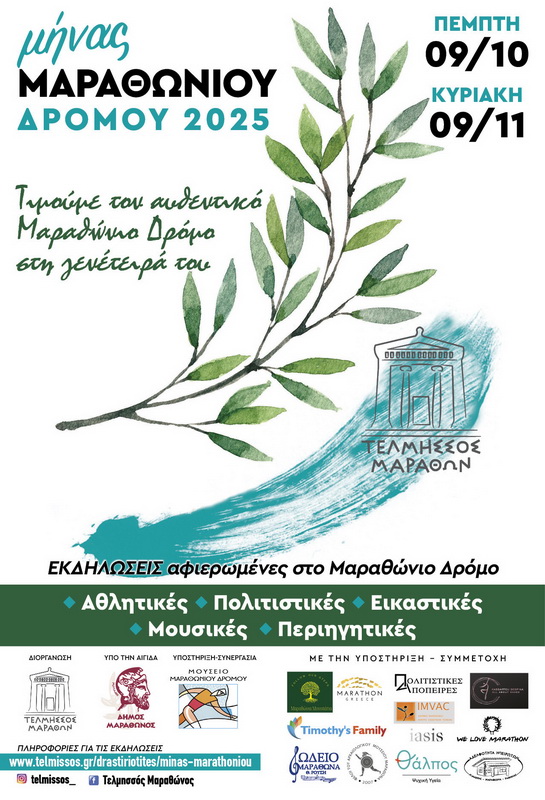 Για να τιμήσει την Ιστορία του τόπου μας, τους Ήρωές μας και την σημαντικότερη Μάχη της υφηλίου, τη Μάχη του Μαραθώνα, ο σύλλογος Μαραθωνοδρόμων του Ιστορικού Δήμου Μαραθώνος, ο ΤΕΛΜΗΣΣΟΣ ΜΑΡΑΘΩΝΟΣ, την Κυριακή 7 Σεπτεμβρίου 2025 και ώρα προσέλευσης 8:00 πμ στο Αρχαιολογικό Μουσείο Μαραθώνα περιοχή Βρανά, θα αναβιώσει την ιστορία διοργανώνοντας το ΔΡΟΜΟ ΜΑΧΗΣ ΜΑΡΑΘΩΝΑ, μια διαδρομή 35 χλμ στα ιστορικά και αρχαιολογικά σημεία της περιοχής μας και ουσιαστικά στο ευρύτερο πεδίο της Μάχης του Μαραθώνα!